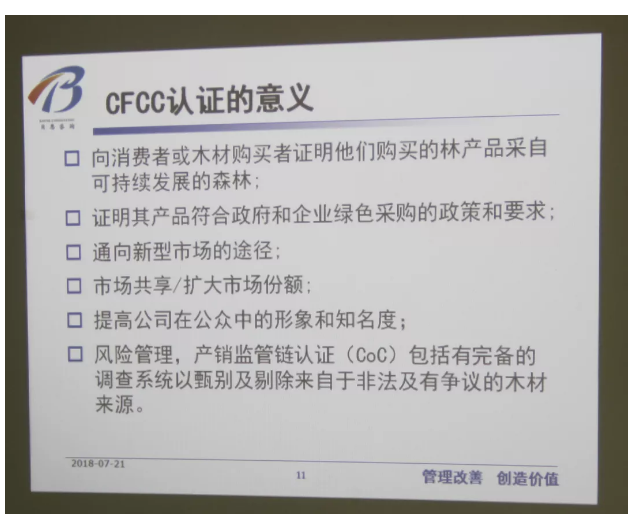 伽立實(shí)業(yè)集團(tuán)邀請(qǐng)來自專業(yè)機(jī)構(gòu)的培訓(xùn)講師,任職PEFC和CFCC認(rèn)證相關(guān)崗位長達(dá)數(shù)十年經(jīng)驗(yàn),對(duì)營銷中心及相關(guān)部門進(jìn)行PEFC和CFCC認(rèn)證培訓(xùn)指導(dǎo)。