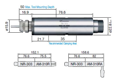 NR-303 | Φ22.8mm | 30,000 min-1 | 2μm以內(nèi) | 夾頭(CHK系列) : 0.5~6.0mm | 215g |