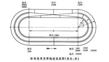 比賽在周長(zhǎng)400米的跑道上進(jìn)行,跑道由兩條直線(xiàn)和兩條180度的弧線(xiàn)連接而成,分內(nèi)、外兩道,道寬5米。內(nèi)跑道的內(nèi)圈半徑為25米,外跑道的內(nèi)圈半徑為30米。比賽時(shí)每組2人,同時(shí)滑跑,每滑1圈交換1次內(nèi)、外道。