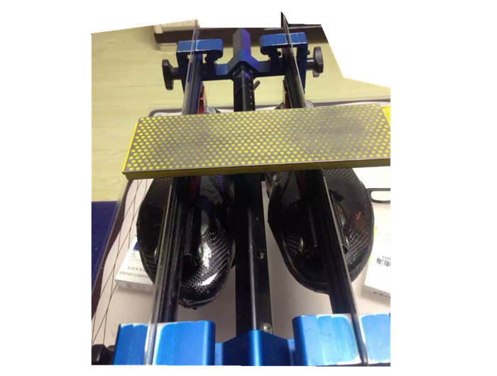 把冰刀倒著固定在架子上,四個(gè)螺母松緊要一致。檢查一下兩個(gè)冰刀前后端是否對(duì)齊,高低、垂直度是否因特殊原因而產(chǎn)生明顯的差距。有的磨刀架帶有冰刃高度固定裝置,可用之。本人的磨刀架因?yàn)闆]有這個(gè)裝置,所以找平的時(shí)候,把上好冰刀的架子倒過來,在瓷磚上找平,然后,擰死螺栓,翻過來開始磨。