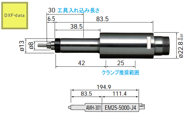 AMH-301 | Φ22.8mm | 30,000 min-1 | 2μm以內(nèi) | 夾頭(CHM系列) : ?1.0~?3.0mm | 370g |