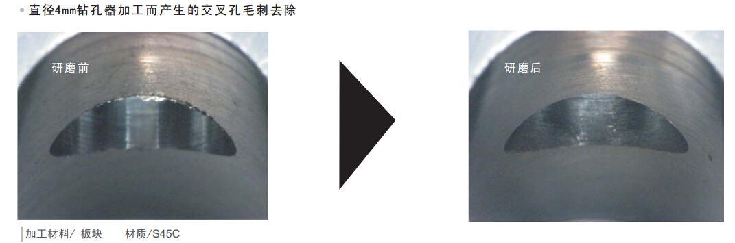 由于旋轉(zhuǎn)的離心力,會擴大刷子,在刷子的前端有研削力,去除圓筒內(nèi)的交叉孔細微毛刺。