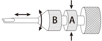 用手指按住到頭安裝的A部分,續(xù)傳B部分,刀頭就能很輕松的拆卸下來(lái)。  |