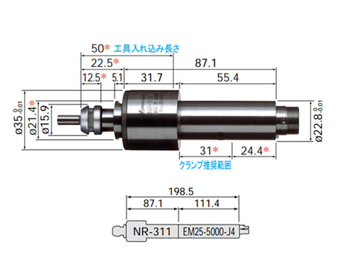 NR-311  | Φ22.8mm  | 30,000 min-1  | 2μm以內(nèi)  | 夾頭(CHK系列) : φ0.5~φ6.0mm  | 370g  |