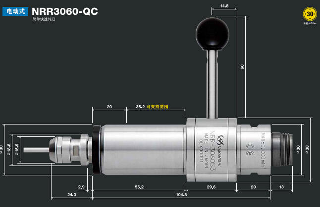 日本NAKANISHI手動快速換刀高速電主軸NRR-3060QC,適合氣動快速換刀,直徑30mm,轉(zhuǎn)速60000轉(zhuǎn)/min,跳動精度1μm以內(nèi),適合鉆孔、磨削等高精度加工。