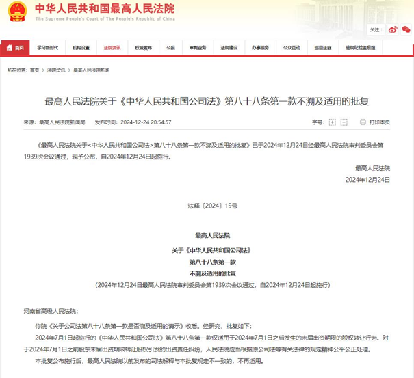 2024年12月24日最高人民法院頒布了關于此條不溯及適用的批復,對原股東不管善意惡意,不分青紅皂白一刀切的做法有了制止,體現(xiàn)了對原公司法等有關法律規(guī)定的精神公平公正認同。